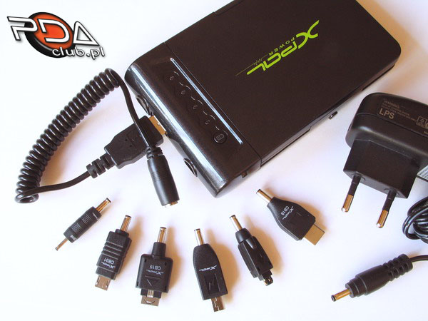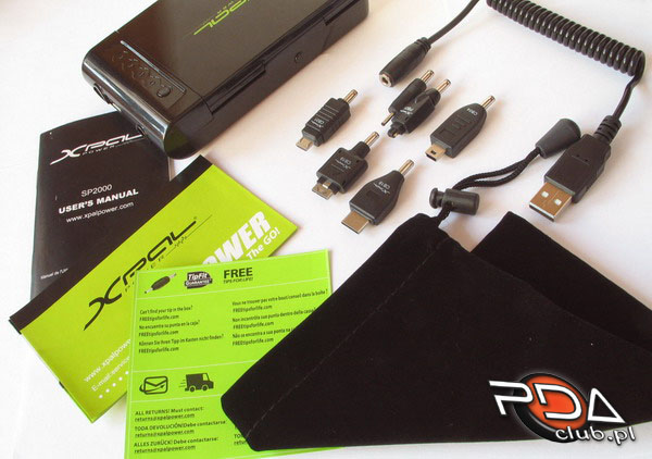 Poza kabelkiem i wymiennymi końcówkami, otrzymujemy jeszcze dwa dodatkowe gadżety w komplecie. Po pierwsze jest to ładowarka sieciowa, która pozwoli podładować Power Pack w domu, bez potrzeby zaprzęgania do tego celu energii słonecznej. Swymi gabarytami przypomina ona zwykłą ładowarkę od PDA lub słuchawki Bluetooth i generuje prąd 5V, 1.5A. Zakończona jest ona wtyczką typu DC a nie miniUSB. Z jednej strony to szkoda, gdyż wtedy moglibyśmy podładować XPAL Power SP2000 z magistrali USB komputera lub typowej palmtopowej ładowarki, co uchroniłoby nas przez niepotrzebnym zabieraniem ze sobą kolejnej ładowarki w podróż. Ładowarka uwidoczniona jest (choć nie w całości) na jednym z zamieszczonych wcześniej zdjęć. Na poniższej fotce są akurat wszystkie pozostałe gadżety dodawane do tego produktu.