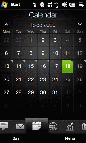 Tutaj pojawiło się parę nowych zakładek, a te znane z poprzednich modeli wzbogacono o kilka nowych funkcji. Pierwsze co zauważyć można po dotknięciu paska zmiany zakładek to to że reaguje on teraz na dotyk delikatnymi wibracjami całego telefonu - bardzo przyjemny dodatek. Ja najbardziej cieszę się z zakładki kalendarza, która pozwala m.in. zobaczyć cały widok miesiąca z zaznaczonymi dniami, do których przypisaliśmy jakieś spotkania. Dodatkowo po kliknięciu na danym dniu, lub po użyciu funkcji dostępnej pod prawym klawiszem SoftKey, możemy łatwo - bez wyciągania rysika - otworzyć okno dodawania nowego spotkania do kalendarza. Niestety samo okno w którym podajemy godzinę czy wybieramy datę nic a nic się nie zmieniło, zatem nadal trudno jest dodać spotkanie bez używania rysika.