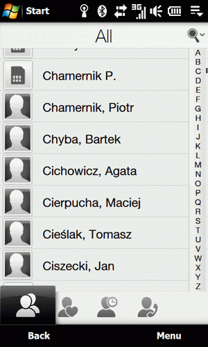 Poza nowym interfejsem dla aplikacji telefonu, mamy również całkiem nowy wygląd i bogatszą funkcjonalność książki adresowej. Wyświetlana jest ona standardowo, w postaci listy pozycji, przewijanych inercyjnie, z możliwością przeskoczenia od razu do danej litery, korzystając z "iPhonowego" paska liter przy prawej krawędzi ekranu. To oczywiście nic specjalnego. Ciekawe jest dopiero to, że mamy tutaj kilka zakładek.