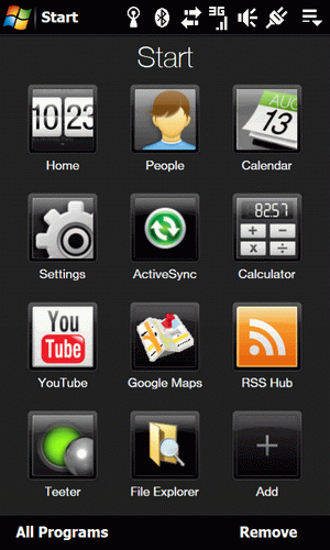 HTC eksperymentowało z Menu Start już w przypadku poprzedniej linii mobilno-okienkowych urządzeń. Tam jednak ograniczono się tylko do nieznacznego powiększenia obiektów wyświetlanych w rozwijanym z tego klawisza Menu. Tym razem programiści HTC poszli znacznie dalej. Menu Start nie posiada już bowiem spuszczanej listy pozycji. Po dotknięciu tej ikony lub wciśnięciu odpowiedniego sprzętowego klawisza, otwiera się pełnoekranowa aplikacja, na której zgromadzić można skróty do ulubionych programów. Wygląda ona podobnie jak zawartość folderu Programs ze starego/oryginalnego Menu Start. Niektóre skróty przypisane są tutaj jednak "na siłę" i nie można tego zmienić (chyba że edytując rejestr), ale do innych lub do wolnych pól podpiąć można dowolne programy.