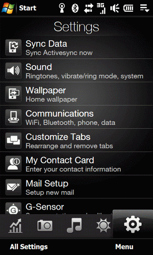 Jedną z ikon których nie można standardowo z ulubionych w Menu Start usunąć, jest skrót do mobilno-okienkowego panelu sterowania, czyli menu Settings. Po kliknięciu w tą ikonę przenoszeni jesteśmy jednak nie do standardowego zakładowego interfejsu znanego z WM, ale do jednej z zakładek TouchFLO 3D, która gromadzi kilka najpopularniejszych, czy najbardziej przydatnych - według HTC - opcji z menu ustawień. Dopiero w tym oknie korzystając z lewego SoftKey możemy otworzyć standardowy panel sterowania.