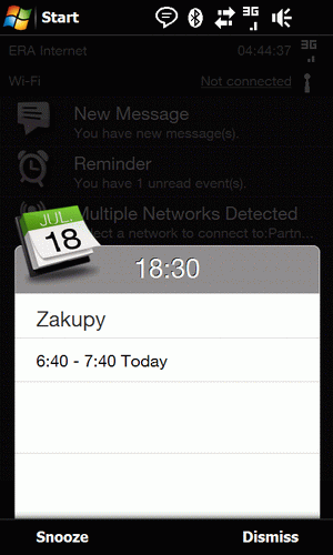 Najwyraźniej HTC tworząc swe Androidowe urządzenia dostrzegło potencjał drzemiący w tym rozwiązaniu i postanowili oni wprowadzić podobny program do świata swych mobilno-okienkowych PDA. Co prawda ikonki nadal wyświetlają się na górnej belce, ale wcale nie musimy w nie specjalnie celować palcem. Wystarczy że dotkniemy tej okolicy, aby naszym oczom ukazała się pełnoekranowa aplikacja gromadząca wszystkie powiadomienia. Doskonale obrazuje to poniższy zrzut ekranu, gdzie poza alarmem z kalendarza widzimy jeszcze komunikat na temat otrzymanego SMSa, wykrytej sieci WiFi, a także statusu połączenia internetowego, realizowanego za pośrednictwem modułu GSM i ewentualnie WiFi.