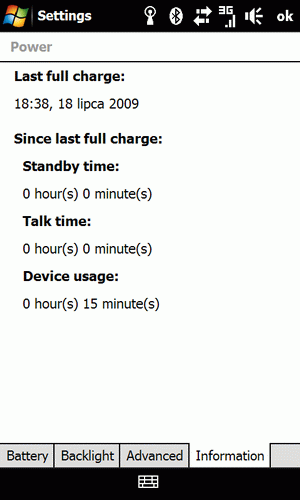 W menu Settings nie wiele się pozmieniało - poza nowym interfejsem BT Managera. Z mniejszych ale przydatnych zmian, wymienić można np. zakładkę informacyjną apletu Power, gdzie znajdują się szczegółowe liczniki czasu faktycznej pracy urządzenia, czasu przebywania w trybie czuwania i czasu rozmów.