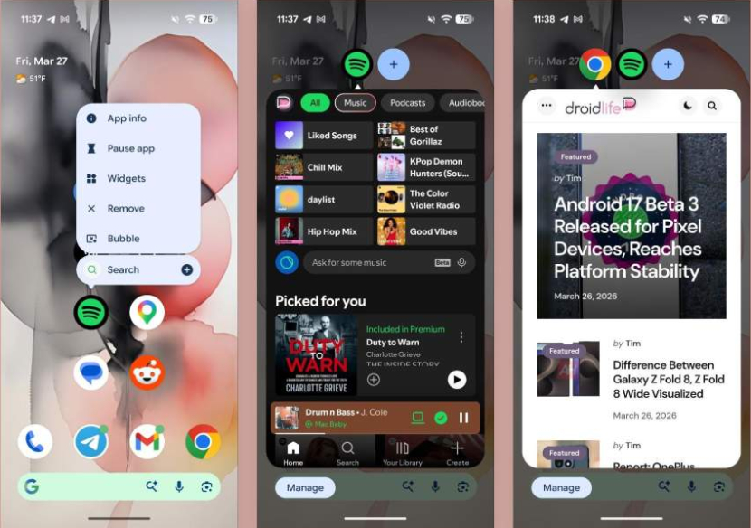 Następną dużą zmianą jest rozwinięcie koncepcji bąbelków, znanych jeszcze z Androida 11, na dowolne aplikacje. Do tej pory bąbelki były głównie zarezerwowane dla komunikatorów, teraz natomiast można umieścić w osobnym bąbelku niemal każdą apkę, długo przytrzymując jej skrót i wybierając nową opcję w menu kontekstowym. W rezultatcie otwierają się zupełnie nowe scenariusze multitaskingu – od szybkiego podglądu map po podręczną notatkę, którą można przesuwać po ekranie i wygodnie chować. Kilka aplikacji może działać w bąbelkach równocześnie.