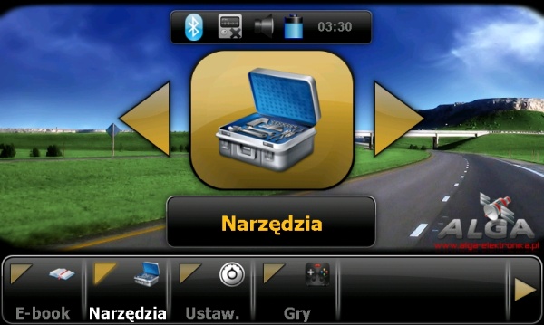 Trzeba przyznać, że menu działa bardzo płynnie i błyskawicznie reaguje na wybór danej opcji. Całość podzielono na 5 sekcji : Nawigacja, Multimedia, Narzędzia, Gry i Ustawienia. Na dolnym pasku, z którego przełączamy kolejne sekcje, umieszczono także bardzo przydatne informacje o stopniu naładowania akumulatora, wolnej pamięci RAM, oraz godzinie.